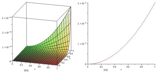 The NTDM solution for and 1 are reported in Table 3. The surface solution behavior of for different values of 1, , and are depicted in Figure 5, and the plot of the solution for at different time intervals is depicted in Figure 5. The error plot of Example 3 show in Figure 6.
