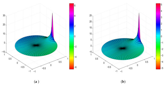 Theorem 4. Let , where h and g are given by (3) and is defined by (10). If thenandThe estimate is sharp and the extremal function isSpecially, if thenThe estimate is sharp and the extremal function isEspecially, let and in (48) respectively, we have (i) If thenThe estimate is sharp and the extremal function is(ii) If thenThe estimate is sharp and the extremal function isIn the following Figure 1, we draw the graph of and respectively. Proof. By using the relation