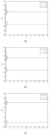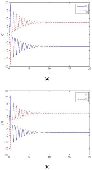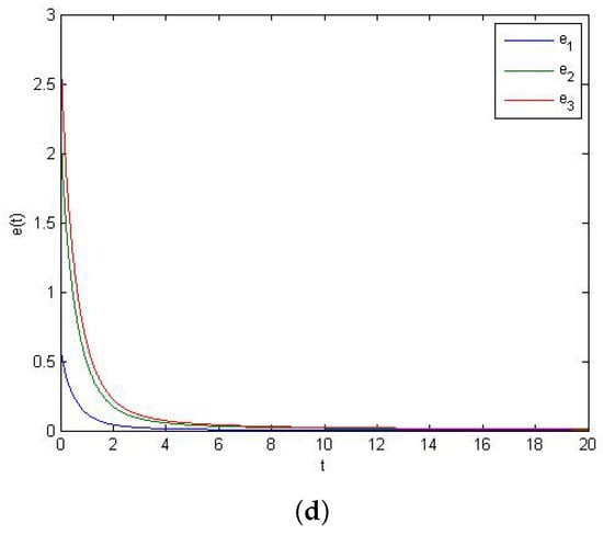 so , then, according to Lemma 1, we have a constant , when . Therefore, the finite-time anti-synchronization of the chaotic systems (6) and (7) is achieved under the controller u.