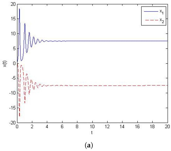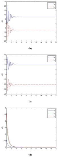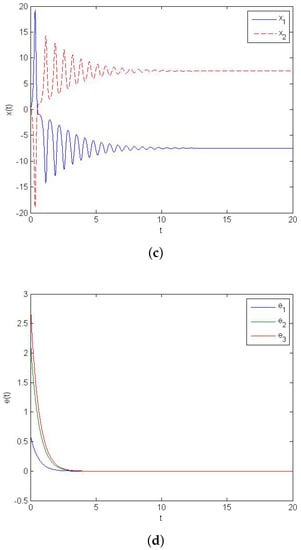 so , then according to Lemma 1, we have a constant , when . Therefore, it can be seen that the error system (20) is stable for a limited time, and we realize finite-time anti-synchronization between Lorenz systems. □