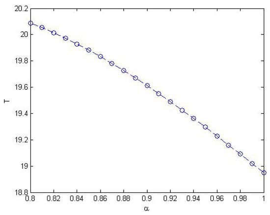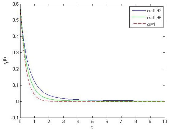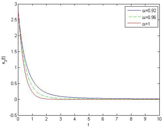 In this section, we will verify the correctness of the main results by several simulation examples of Lorenz systems of integer- and fractional-order with the same conditions. The simulation method adopted was the Adams–Bashforth–Morton predictive-correction scheme [44] with a step size of 0.01. The systems’ parameters were set to , , ; In addition, for which condition and . The initial conditions of the systems were taken as . According to Lemma 1, the estimated time for integer-order Lorenz systems (18) and (19) to achieve finite-time anti-synchronization is 18.9501. Figure 1 shows the state trajectory curves. When the order of fractional Lorentz system is a = 0.96 and a = 0.9 respectively, the finite time anti-synchronization time of system (24) and system (25) is estimated by using inequality (32), which is 19.2284 and 19.6110. The simulation results are depicted in Figure 2 and Figure 3. Figure 4 shows that the time T of finite-time anti-synchronization in the Lorentz system varied with the increase of system order from 0.89 to one. Figure 5, Figure 6 and Figure 7 further show the effect of order on finite time T.