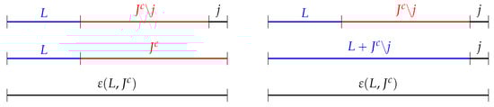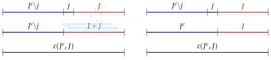 The left-hand side of Equation (A9) corresponds to taking the sets , I and , in this order, and then merging and sorting with I and then merging and sorting the resulting set J with , as shown in the left column of Figure A2. On the right-hand side, we start we the same three lists, but we first merge and sort I with , and then we get the whole list by merging and sorting the result with , as represented in the right column of Figure A2. Thus, starting from the three sets and rearranging them in different ways, we get the same final ordered list, and since the signatures of the left-hand side and right-hand side are the same, and Equation (A9) is proved. As a consequence, Equation (14) is verified.