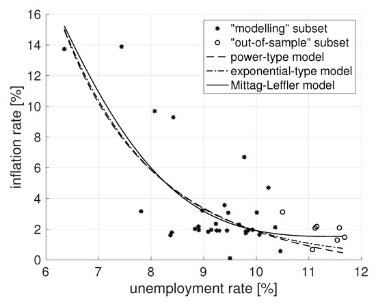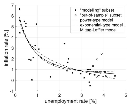 The result of the French Phillips curve fitting is also shown in Figure 3, where it is possible to observe a similar behaviour of all three models, i.e., with the increase of the unemployment rate the inflation rate exponentially decreases. However, for the last samples, the decrease of the ML model slows down in comparison to the power-type and exponential-type models. This behaviour of the ML model is obviously better describing the trend of the “out-of-sample” subset. This is also confirmed by the smallest SSE value of the ML fitting curve to the “out-of-sample” subset (see Table 2).