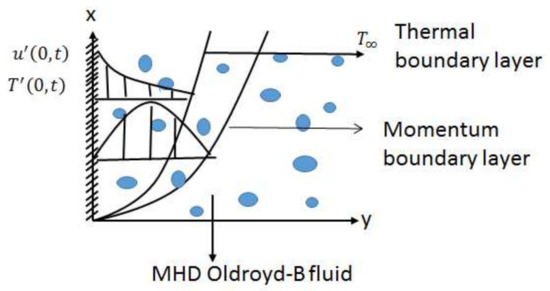 The unsteady, incompressible and MHD flow of Oldroyd-B fluid over an infinite vertical plate under the Boussinesq’s approximations can be described by the subsequent equations [27,28]. The Boussinesq’s approximations is used to find the buoyancy force [29].