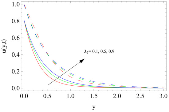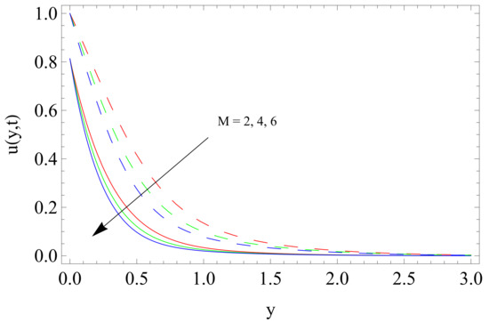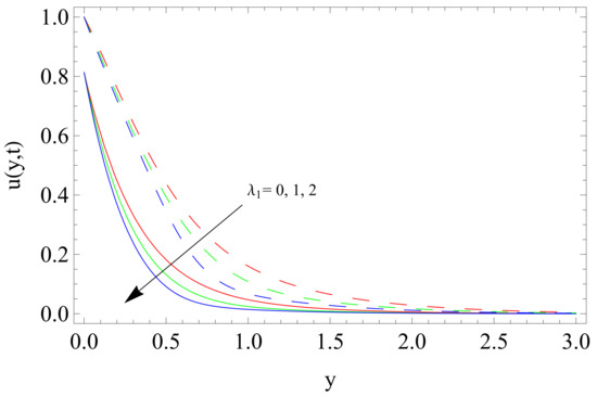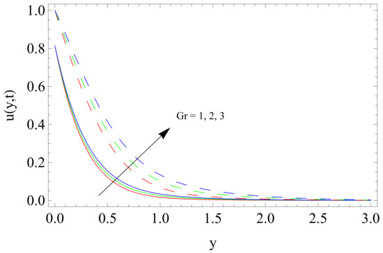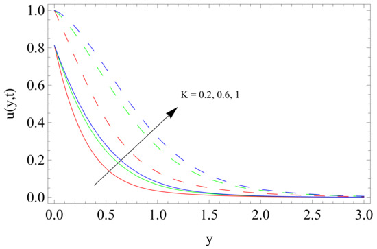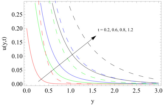 The present section comprises of solution profiles considering different parameter values, such as, Prandtl number (Pr), Grashof number (Gr), magnetic parameter (M), porosity (K), relaxation time , and dimensionless time (t). The numerical results are divided into two main categories: (1) Oldroyd-B fluid model with ramped wall temperature and ramped wall velocity and (2) Oldroyd-B fluid model with constant temperature at wall and ramped wall velocity. In the numerical results, the solid line is used for Oldroyd-B model considering ramped temperature profiles and velocity conditions, while the dashed lines are used for Oldroyd-B model with constant temperature and ramped velocity conditions. Figure 2, Figure 3, Figure 4, Figure 5, Figure 6, Figure 7, Figure 8, Figure 9 and Figure 10 are produced by using the software “Wolfram Mathematica 9.0” (Wolfram Research, Champaign, IL, USA).