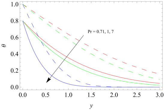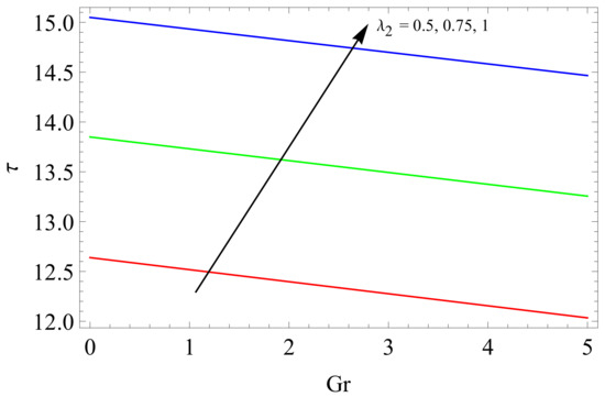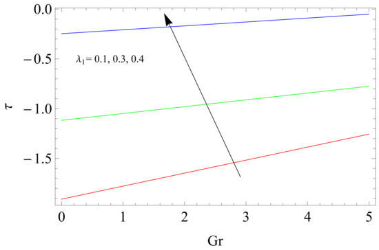 Figure 8 shows the relationship between shear stress on the wall and Gr under the influence of relaxation time . The increase in brings decrease in magnitude of the . Internal friction is significantly decreased owing to small viscosity. Figure 9 illustrates that retardation time causes the shear stress on the wall to increase. Figure 10 shows the effects of Prandtl numbers Pr on the temperature profile. It is observed that the temperature profile decreases as Pr increases because the moving fluid gets less heat transfer from the solid plate as Pr increases from 0.7 to 7.