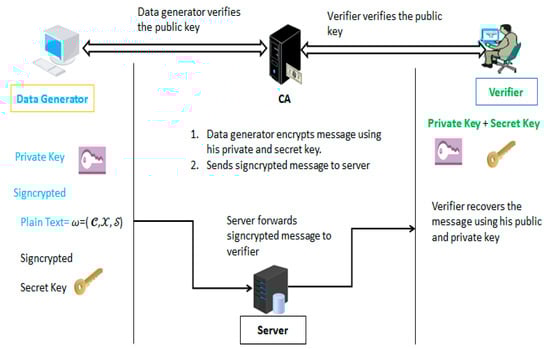 In Figure 1, we describe the proposed model of our scheme. Our approach contains four entities—data generator, signcrypter, certificate authority, server and verifier/unsigncrypter. Before starting communication the certificate authority first published the entire public parameters e.g., , The data generator verifies the public key of verifier from a certificate authority and then performs the signcryption process with a fresh nonce. After producing the signcryptext, the data generator uploads signcryptext to the server and the server just forwards it to the legitimate receiver/verifier. Later, the verifier first verifies the public key of data generator/signcrypter and then performs the unsigncryption process.