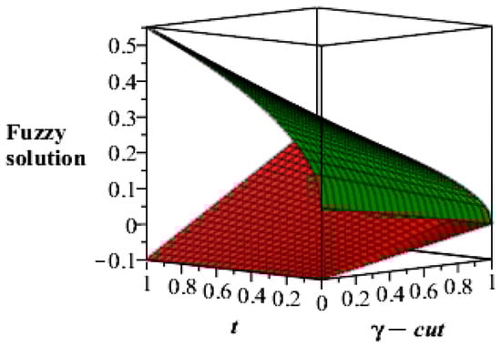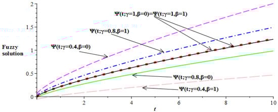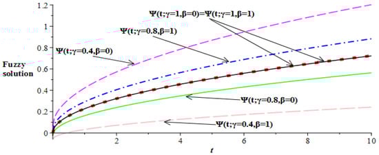 Figure 3. Lower and upper bounds fuzzy solutions of ψ ( t ) at α = 0.5 .