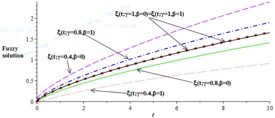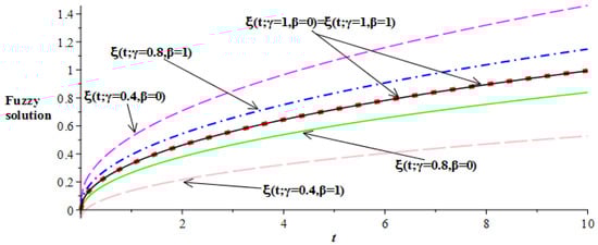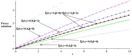 Figure 6. Lower and upper bounds fuzzy solutions of ξ ( t ) at α = 0.75 .