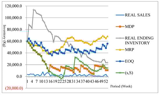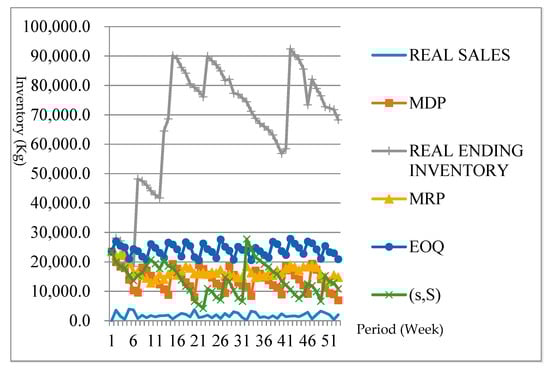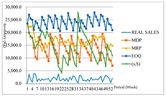 This section explains the optimal inventory policy calculated via the MDP-a policy that helps managers to minimize order quantities while still meeting quarterly demands. Results for comparison were calculated using the EOQ, MRP, and (s,S) models. In addition. the ABC analysis is an early simple method in the field of inventory management. It is also called the cycle counting method, which only defines the product classification method and does not specify the calculation of order quantity. On the other hand, this paper uses MDP method for analysis. In the case of most large-scale products (belonging to the A-type products), the company has to find the optimal policy for each period, which already contains the concept of ABC analysis. So, in this comparison of subsequent empirical analysis, the ABC method is not implemented for analyzing this value.