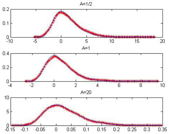 Here, we choose , respectively. The results are presented in Table 2 and Table 3 and Figure 1, Figure 2 and Figure 3. Note that the second derivative of Cauchy distribution function is unbounded on ; consequently, this kind of distribution could not converge to uniformly in this domain. For this reason, we only test the asymptotic behavior of extremes by feedback sketch. The results are presented in Figure 3. These results suggest that the uniform convergence rate is of order for different A as predicted by Theorem 1. Figure 1, Figure 2 and Figure 3 show that the asymptotic density is essentially coincident with the extreme value density as posed in Remark 1.