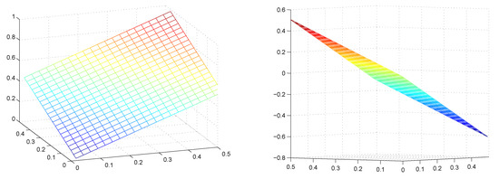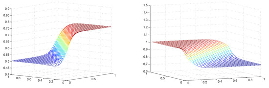 In Table 3, the errors and the CPU time of the present method at and are listed. One can conclude that our method is efficient in sense that it could get a satisfying error with rather little CPU time. Figure 1 describes the numerical solutions of by the present method, as expected, the present method could simulate Example 1 quickly and rather precisely.