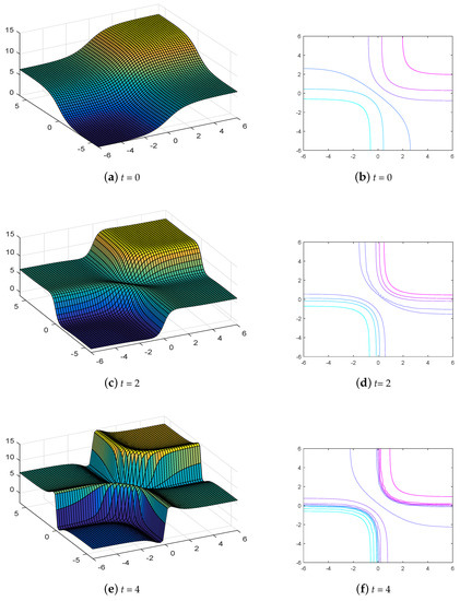 The example depicts the superposition of two orthogonal line solitons, which is also used by many researchers to verify their schemes [4,29]. The numerical computations are simulated using equi-distributed knots, with a space width and time steps . In this example, the parameter c is chosen as . Figure 3 shows that our methods could simulate the solitons rather exactly. That is to say, our scheme can solve a wild range of high-dimensional PDEs efficiently.