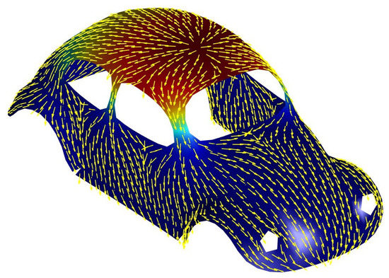 The remainder of this section details the steps to solve Equation (1), and the details of our mesh parameterization algorithm. The algorithm was implemented in MATLAB® [24], except for the Poisson Surface Fills which were implemented in C++ using the PCL library [25]. Figures including triangular meshes, scalar fields, vector fields, and 2D parameterizations were produced in MATLAB®. Figures including texture maps on the surface were produced using MeshLab [26].