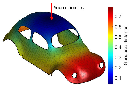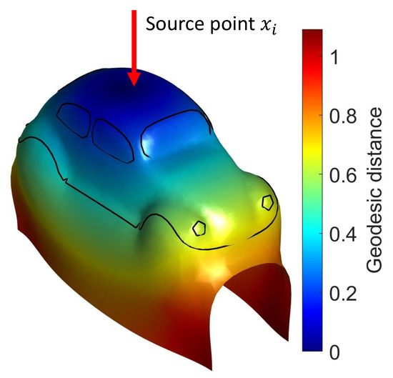 where is the vector of geodesic distances and is the divergence field of the normalized gradient [23]. Figure 4 plots the estimated geodesic distance field for the vertex .