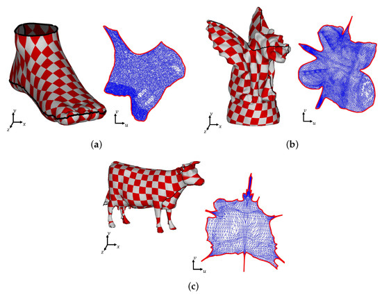 - Mejia, D.; Acosta, D.A.; Ruiz-Salguero, O. Weighted area/angle distortion minimization for Mesh Parameterization. Eng. Comput. 2017, 34, 1874–1895. [Google Scholar] [CrossRef]