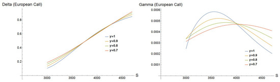 We can observe that, for any , the graph of the dollar Gamma remains positive and therefore works in favor of the long call position. In other words, the P&L of the call option will outperform the one of the hedge, because the option price is a convex function of the asset price. Thus, this well-known feature of the conventional Black-Scholes theory is preserved in the framework of the time-fractional diffusion model. The presence of the parameter , however, significantly affects the impact of option’s maturity to the Gamma P&L. As seen in (102), the Black-Scholes dollar Gamma is equal to and therefore is maximal for short-term options (i.e., for small ). However, when tends to zero, then tends to and becomes independent of . Similarly, when , the option will no longer outperform the hedge, and the P&L of the portfolio will remain flat, whatever the option’s maturity. This phenomenon illustrates the temporal redistribution induced by the time-fractional parameter . Finally, Figure 2 demonstrates that the Gamma P&L is a decreasing function of as soon as , and there is an inflection at the point :