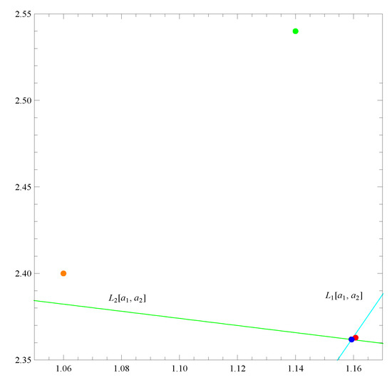 Now, we choose which is represented as orange and green dots, respectively, in Figure 1. For Equation (5) in Theorem 1, we can obtain the following parameters: