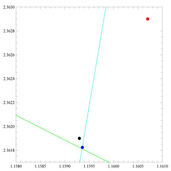 . In addition, are represented as red and black dots, respectively, in Figure 1. Since all the iterations are not visible in Figure 1, hence, we have magnified the graph to represent the approximate root of Equation (5) in Figure 2. In Figure 2, the blue dot represents the approximate root of Equation (5). In this case, the solution of Equation (5) is satisfied, which confirms that the unique solution of exists in . As a solution of Equation (1), we acquire the vector after the second iteration.