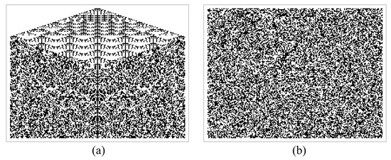 In Figure 1a, the evolution state diagram of the cellular automaton is shown when the initial configuration is given by . Furthermore, in Figure 1b, the evolution state diagram associated to is introduced when the initial configuration is randomly defined.