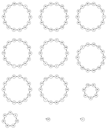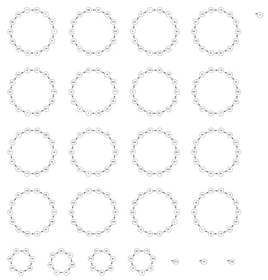 Taking into account the notion of reversibility and the interpretation of the dynamics of in terms of linear algebra, this cellular automaton is said to be reversible when its local transition matrix is nonsingular, and consequently its inverse is the local transition matrix of the inverse cellular automaton. Consequently, in this case, the order and characteristics of the transition matrix determine the reversibility of the cellular automata. For example, and are reversible, whereas is not. In Figure 2 and Figure 3, the global state transition diagrams of and are shown; note that as they are reversible, each configuration has a unique predecessor. In this case, each configuration is represented by the number . Conversely, is not reversible, and some configurations in the global state transition diagram have more than one predecessor (see Figure 4).