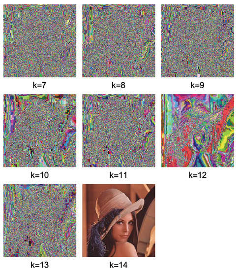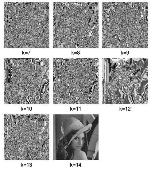 In Figure 5 and Figure 6, two illustrative examples of this technique are shown. As the global state transition diagram of exhibits 16 cycles of length 14, four cycles of length 7, and four time-invariant configurations (see Figure 3), is a periodic transformation of period 14. As a consequence, the original image is recovered after 14 iterations.