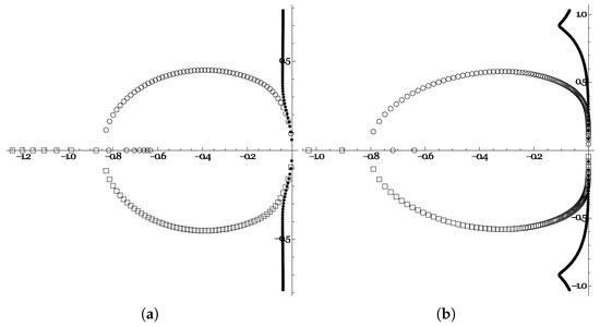 Analogously, Figure 2 shows the location of the zeros of when t varies from to (panel (a)) and from .15 to (panel (b)), both cases with a step size of 0.02. The image on the left corresponds to . Notice that the two real zeros (squares and circles) approach a common point () just before becoming complex zeros. This occurs at .1287. A similar situation (occurring when .1238) appears in the image on the right, which corresponds to the case . Furthermore, all zeros tend to the origin when as described in Corollary 5.