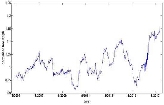 This paper employs a moving window correlation coefficient to compute the relationship between FX markets. To guarantee the statistical reliability, we choose the window length and roll forward at intervals. We analyze dynamic FX networks properties from the index of normalized tree length based on Formula (3), and the results are shown in Figure 1.