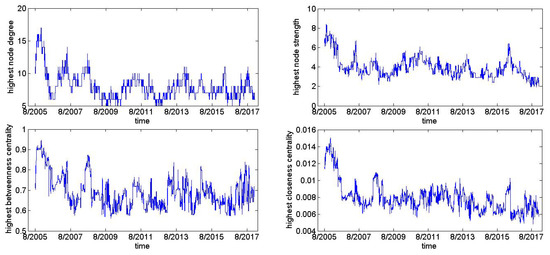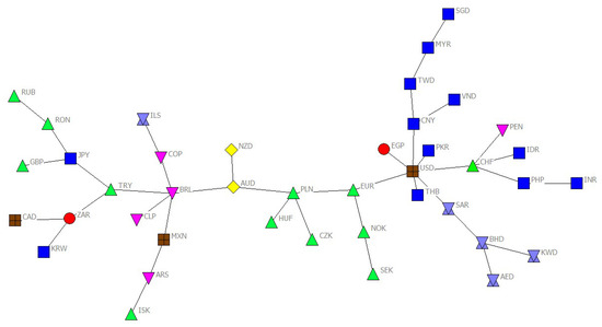 In general, there are two methods to build FX networks: one is to use static methods and the other is to employ time-varying methods. Mcdonald et al. [30] was the pioneer for adopting the Pearson correlation coefficient and the minimum spanning tree (MST) method to build the static FX network and found that USD was predominant. Thereafter, similar studies applied these methods to analyze the static FX network topology, such as community structure [31,32,33], node degree distributions [34] and centrality measures [35,36,37]. In addition, other methods are adopted to establish an FX network and studied their static characteristics. Wang and Xie [38] applied the copula model and the MST method to build an FX network, and the study found that USD plays a dominant role in the FX market. Cao et al. [39] utilized the mutual information method and threshold method to set up an FX network, and the research found that the FX network displayed small world properties.