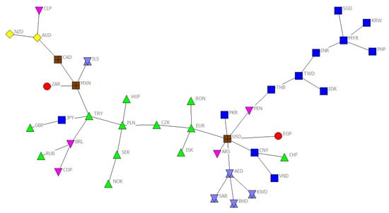 - Jang, W.; Lee, J.; Chang, W. Currency crises and the evolution of foreign exchange market: Evidence from minimum spanning tree. Phys. A Stat. Mech. Appl. 2011, 390, 707–718. [Google Scholar] [CrossRef]