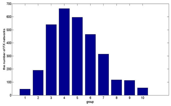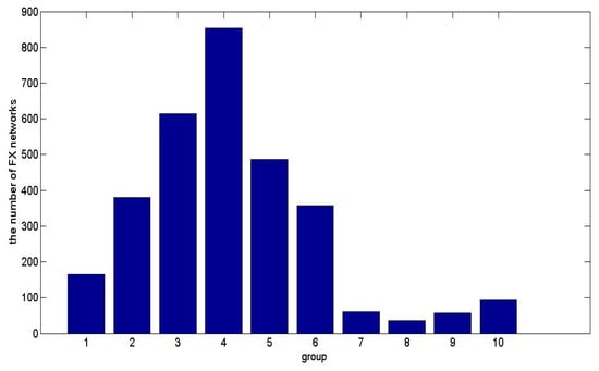 It can be seen from Figure 7 that (1) the quantity of FX networks, which is attributed to group 4 (with volatility varies from 0.004423 to 0.005178), is the largest in all groups; (2) the number of FX networks with low volatility are more than those of the FX networks with high volatility; and (3) the quantity of groups 7 to 10 (with volatility varies from 0.002146 to 0.004420) contains the smaller FX networks.