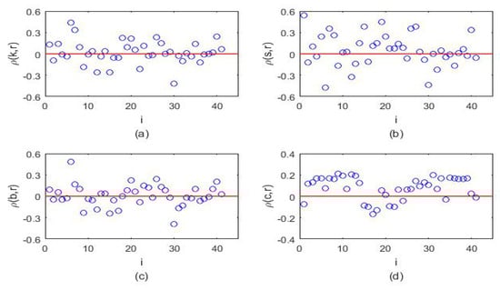 Table 4 summarizes the Pearson correlation coefficients between each pair of FX return volatility and centrality measures, and the results are expressed as Figure 12. We can find that 26 FX markets’ volatility (63.41% of them) significantly negatively correlated to their node degrees, 23 FX markets’ volatility (56.10% of them) significantly negatively correlated to their node strengths, 21 FX markets’ volatility (51.22% of them) significantly negatively to their betweenness centrality, and 18 FX markets’ volatility (43.90% of them) significantly positively correlated to their closeness centrality. In total, it can find that FX volatility is negatively correlated to their centrality measures.