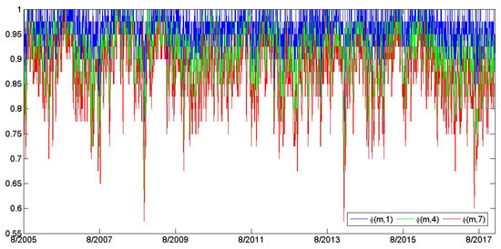 The survival ratio is computed by Formulas (9) and (10), which is examining the FX network’s consecutive stability. Figure 13 presents the survival ratio of the FX network at different steps. This paper calculates the steps of 1, 4, 7.