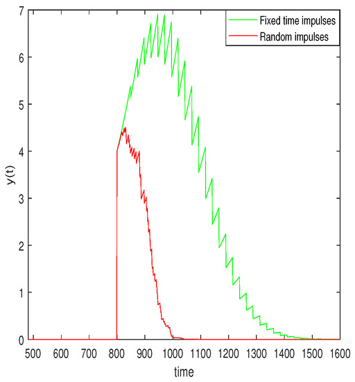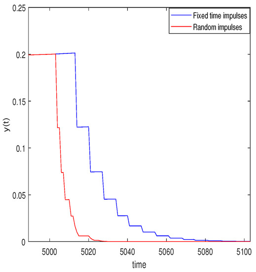 Let , , , , and impulse arrival rate . Then, we choose the Lyapunov function , suppose , from the Corollary 1, we get . Hence,