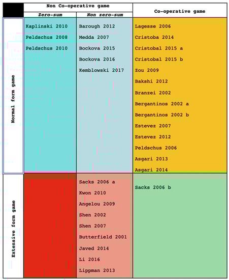 Here, we propose a complex matrix classification. On one-hand, games employed in game theory can be classified into non-cooperative games and cooperative games. One subclassification of non-cooperative games is zero-sum games and non zero-sum games. Zero-sum games cannot by definition exist in a cooperative game, as if the total pay-off for the community is by definition zero, it cannot be a fixed (non-zero) value and it cannot be shared. Another possible subclassification of non-cooperative games is common interest games and non-common interest games, but since the papers we review do not use common interest games, this subclassification is not necessary here. Both non-cooperative games and cooperative games are used by papers reviewed here. On the other hand, games can also be classified into normal-form games and extended-form games. Both normal-form games and extended-form games are used in the papers we review here.