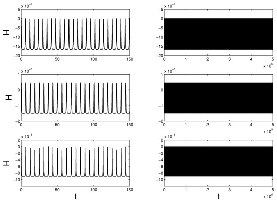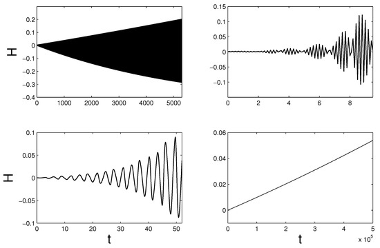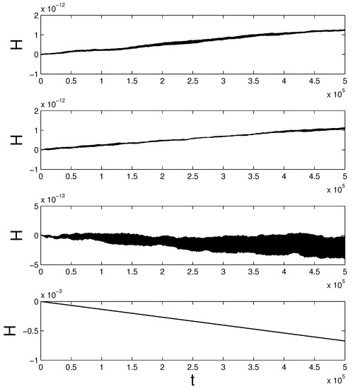 We set in Equation (116), so that for the considered solution. Figure 7 and Figure 8 show the behavior of the numerical Hamiltonian over a long integration interval. The 3- and 4-stage Lobatto IIIA-IIIB integrators performed better than for Kepler’s problem. In the case of the Gauss methods, the Hamiltonian stayed virtually constant—the visible minor erratic oscillations are the result of round-off errors. The Radau IIA scheme demonstrated a slow but systematic drift.