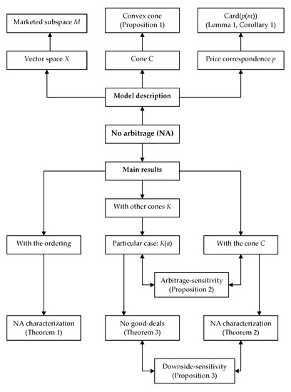 However, in this paper we have divided the algebraic characterizations of NA into two groups: those concerning the preference relation defined on the space of contingent claims (Section 3) and those involving the cone (Section 4). In this last section, following the work by Černý and Hodges [5], we have introduced new cones which do not necessarily include government bonds. Subsequently, the concepts of arbitrage- and downside-sensitivity have been incorporated to analyze the relationship between the absence of arbitrage and no good deals.