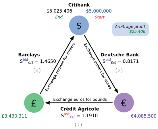 Figure 2 describes an arbitrage and gives a graphical visualization of the so-called triangular arbitrage (a bid price is the highest price that a buyer is willing to pay for a good; on the other hand, an ask price is the price that a seller states s/he will accept; ask is always greater than bid). In effect, observe that: