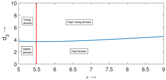 as we have and at . Now from the expression (23), we can notice that is positive if or and . Since holds for our considered system, then the condition for the positivity of reduces to . Therefore, the Turing bifurcation boundary is given by