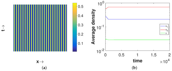 (a) Plot of stationary Turing pattern exhibited by , (b) time evolution of the average densities of three species. and , other parameter values are mentioned in (25).
