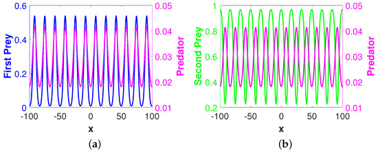 subjected to non-negative initial conditions and periodic boundary conditions. Here, , and respectively denote the densities of the three species at spatial position x and time t. The bounded spatial domain is given by , where . The positive parameters represent the diffusion coefficients for two prey and one predator species, respectively. Note that the equilibrium points corresponding to the temporal model (1)–(3) also serve as the spatially homogeneous steady states for the model (11)–(13).
