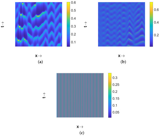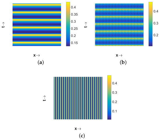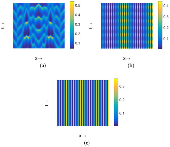 Plots of different types of patterns exhibited by for . Three different patterns are obtained for (a) ; (b) ; (c) . Other parameter values are mentioned in (25).