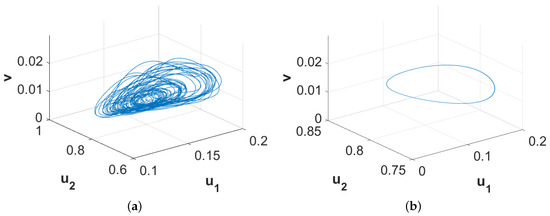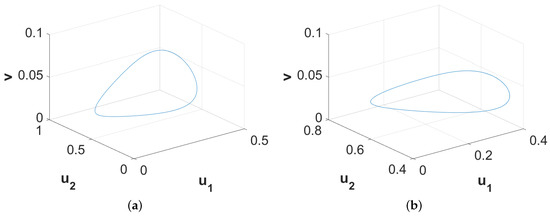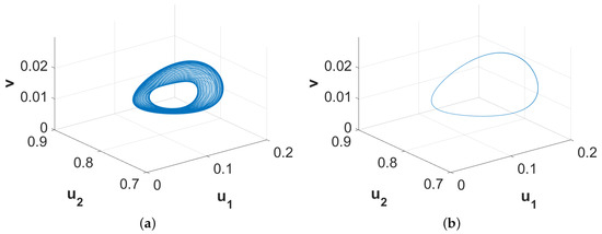 All patterns exhibited in Figure 3a, Figure 5 and Figure 8 are stable in the sense that their nature will not alter with further increment in time. However, the considered system (11)–(13) can produce long transient patterns in order to reach the final stable patterns. Such an instance of long transient pattern can be found for and along with other parameter values mentioned above. Figure 10 exhibits the phase diagrams for the spatially averaged densities of the considered three species for and , respectively. Since the phase diagram presented in Figure 10a is restricted to an annular region, we can term the nature of the corresponding spatiotemporal distribution as quasi-periodic which persists for approximately . On the other hand, the phase diagram presented in Figure 10b clearly shows the periodic nature of the corresponding spatiotemporal distribution and this pattern is stable for the considered parameter values. With the increment in time, the width of the annular region gradually decreases and finally the region settles into a limit cycle. However, this long time period for the existence of quasi-stable and quasi-periodic pattern can be few or even hundreds of generations for certain species. Therefore, this type of existence of long transient pattern and then finally convergence into a stable pattern can provide an alternative explanation for ecological regime shifts apart from the usual concept of exogenously sparked regime shifts.