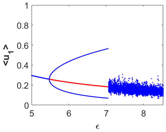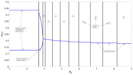 Single parameter bifurcation diagram for the spatially averaged density of first prey population () with respect to the parameter for the spatiotemporal model (11)–(13). Here, we have used pulse type initial population distributions for each value of . Other parameter values are mentioned in (25) with .