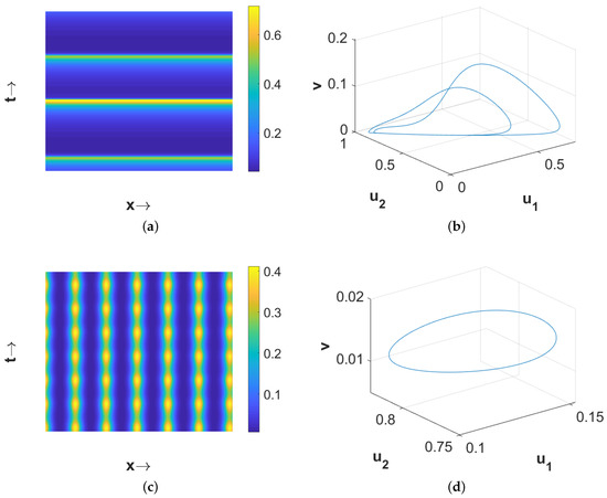 Another interesting finding is that the spatial population distributions depended on the spatial domain size when the parameter values were taken far from the temporal-Hopf bifurcation threshold. The patterns presented in Figure 13 are numerically computed over the one-dimensional spatial domain with the same parameter values used for Figure 8a,c. Figure 13a suggests that the smaller domain size can produce a two-periodic pattern while the larger domain size produces a chaotic one. Also, Figure 13c indicates that the smaller domain size can give rise to periodic in both the space and time population distribution while the larger domain size gives a stationary heterogeneous distribution. The two-periodic and periodic nature of the patterns presented in Figure 13a,c can be confirmed by the phase portraits of the spatially averaged densities in Figure 13b,d, respectively. However, we did not find any effect of the domain size on the resulting patterns presented in Figure 3, Figure 5 and Figure 8b. Therefore, our numerical findings suggest that not only certain parameters associated with a model play crucial roles in the emergence of different types of spatial population distributions but also the spatial domain size can potentially play a key role in shaping the population distributions.