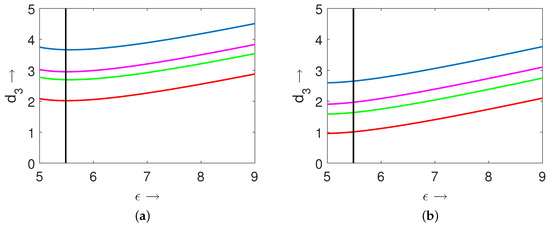 Plots of the temporal-Hopf and Turing bifurcation curves in -parameter space for (a) , and (b) . Here, black vertical straight line corresponds to the temporal-Hopf threshold, blue curve represents the Turing curve for , magenta curve represents the Turing curve for and , green curve represents the Turing curve for and , and red curve represents the Turing curve for . The black vertical straight line has been drawn by solving the equations presented in (9) simultaneously and the red curve has been drawn from the Equation (39). The magenta and green curves have been drawn from Equations (A4) and (A5), respectively. Brief derivations of Equations (A4) and (A5) are provided in Appendix B.