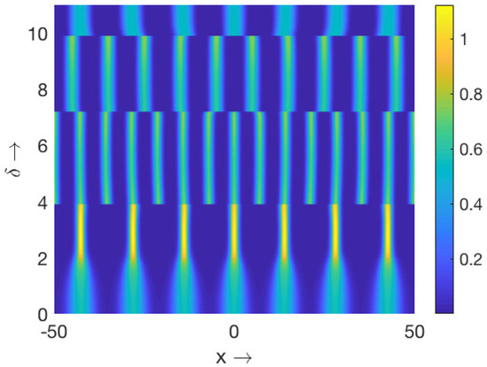 In a similar manner, one can efficiently construct a bifurcation diagram using backward continuation technique by reversing the process encapsulated in the above algorithm. Forward continuation technique results in more or less similar bifurcation diagram as the Figure 11 and accordingly we do not include it here. On the other hand, we observed significant changes in the bifurcation diagram using backward continuation technique and the resulting dynamics are encapsulated in Figure 12. From this diagram, we can observe that the period-doubling route to chaos has been destroyed and spatially heterogeneous chaotic regime survives for larger range of -values. Overall, bifurcation diagrams presented in Figure 1, Figure 11 and Figure 12 indicate the existence of alternative stable states for the model (11)–(13). Note that these states indicate the coexistence of all the three species and can be both the spatially homogeneous and heterogeneous population distributions.