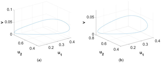 The possible equilibrium points for the temporal model (1)–(3) can be explicitly derived from the system of algebraic equations arising by equating the reaction parts to zero. The system (1)–(3) admits the following six trivial and semi-trivial equilibrium points: , , , , and . Also, this system admits a unique coexistence equilibrium point , where