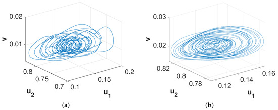 The dependence of results on the domain size can be explained as follows. If there exists a spatially periodic solution with the wavenumber k and the length of the interval , where , then this solution can be naturally extended by periodicity to the interval , where . Moreover, if we increase the length of the interval, solutions with other wavenumbers can appear due to their successive bifurcations from the spatially homogeneous stationary solutions. Furthermore, solutions with a fixed wavenumber persist under the variation of the length of the interval in some range of lengths. Hence, solutions with different wavenumbers can coexist for the same length, and their number increases with the increase of L. This multiplicity of solutions is conventionally observed in bifurcation problems. Their stability and basins of attraction depend on the length L. The interaction of different solutions can result in complex dynamics including chaotic behavior. The transition from two-periodic oscillations to chaotic oscillations for a larger length (cf. Figure 8 and Figure 13) corresponds to this understanding of the dynamics of solutions. It is also possible that the initial condition remains in the basin of attraction of the same solution, such that we observe the same dynamics for a changing interval.