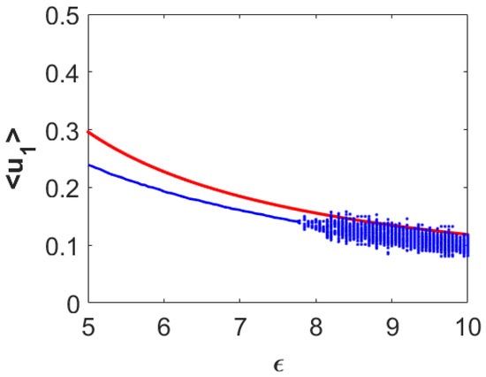 Finally, we want to explore the effects of the extent of nonlocality on the dynamics presented in Figure 1 and Figure 11. For this purpose, we considered the same parameter values as it was used to prepare the bifurcation diagram presented in Figure 11 with . The resulting dynamics are encapsulated in Figure 20. In this figure, the red colored curve corresponds to the first prey component from the spatially homogeneous coexistence steady state and blue color stands for the simulation results of the nonlocal model (27)–(29). Here, we can observe that the average densities of the first prey species stayed almost below the steady state values throughout the region in presence of the nonlocal interactions. Also, note that spatial heterogeneity in population distribution appeared throughout the region as opposed to that for both the temporal and local spatiotemporal cases. This figure reconfirms that the spatially heterogeneous population distribution can suppress the spatially averaged density for the first prey species. The same scenario happens for the second prey species, whereas, the spatial heterogeneity enhances the spatially averaged density for the predator population. For the sake of brevity, we restrict ourselves from displaying the corresponding bifurcation diagrams for both the second prey and predator species.